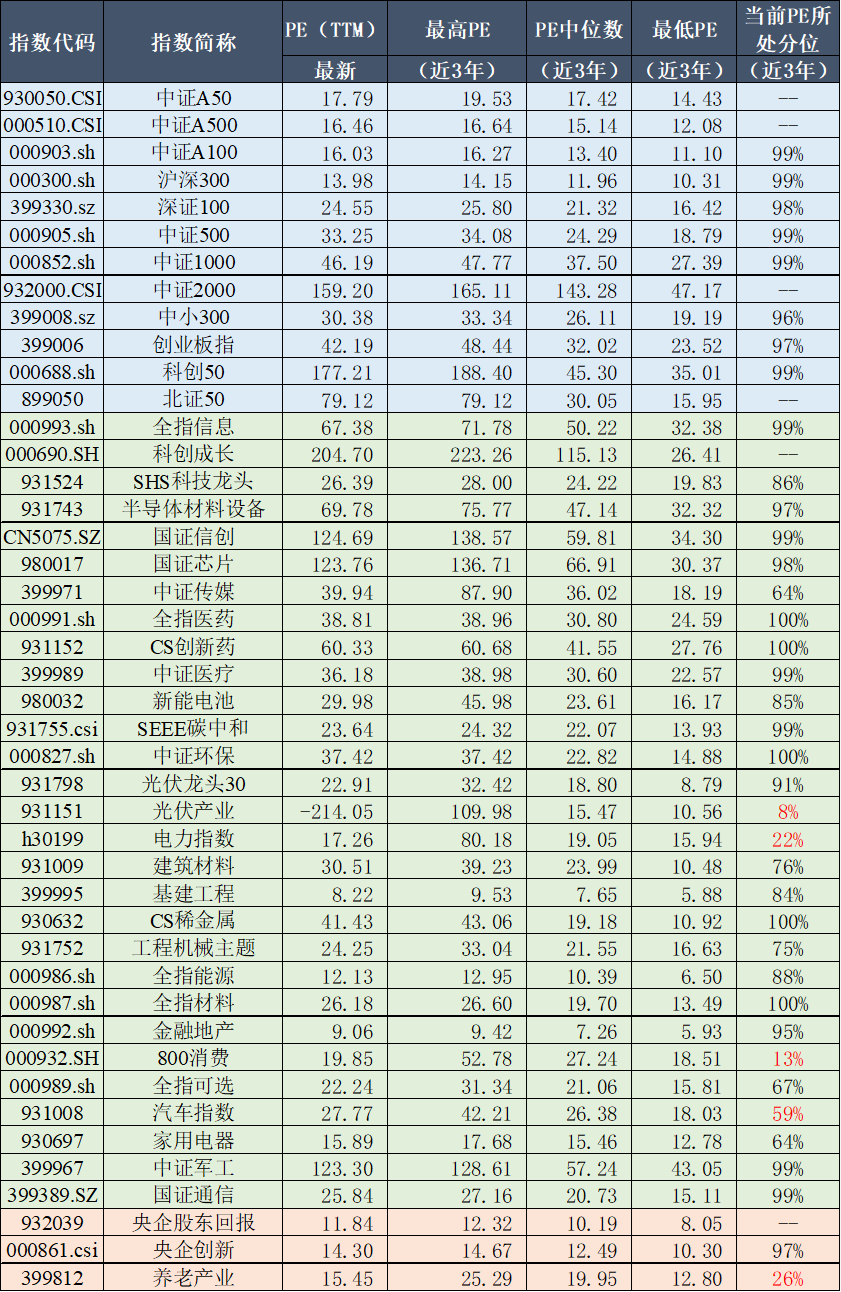 旗下产品跟踪指数近三年PE情况及当前所处位置