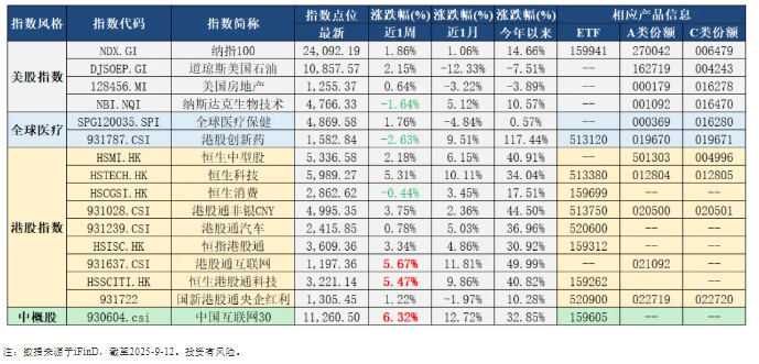 海外市场方面:中国互联网30表现最好,涨跌幅为6.32%;港股创新药指数表现最差,涨跌幅为-2.63%。