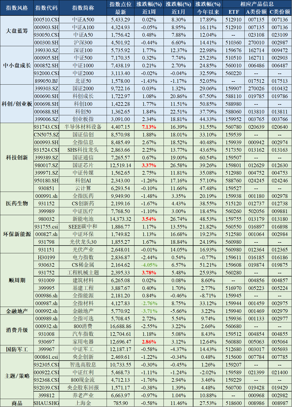 主流指数中,半导体材料设备上涨7.13%,表现最好;CS稀金属下跌4.05%,表现最差。