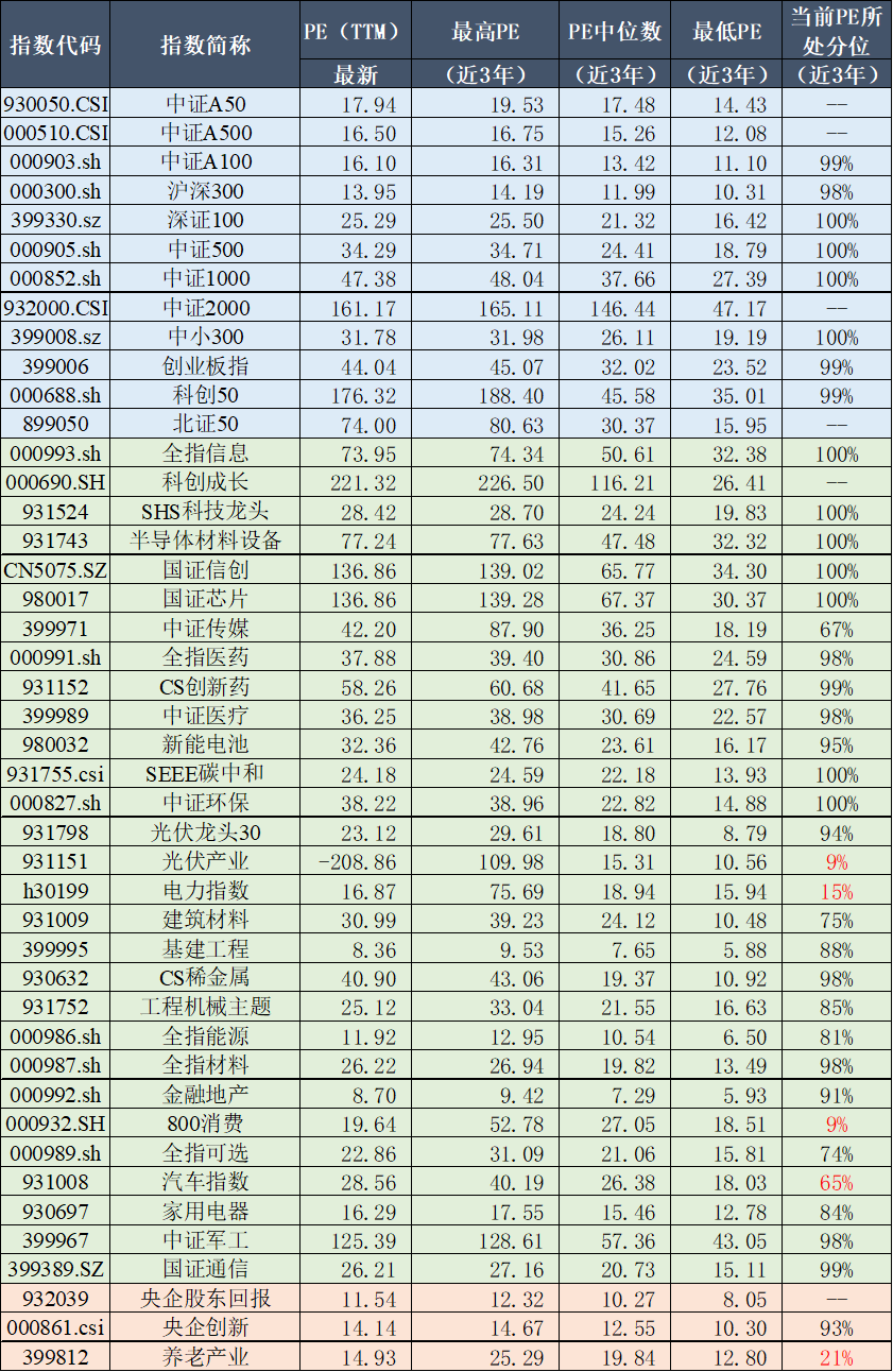 旗下产品跟踪指数近三年PE情况及当前所处位置