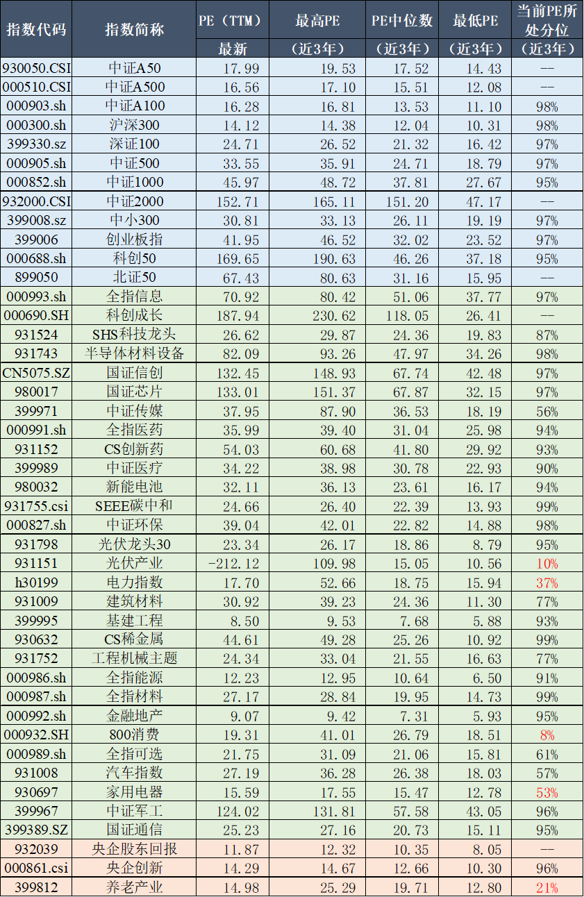旗下产品跟踪指数近三年PE情况及当前所处位置