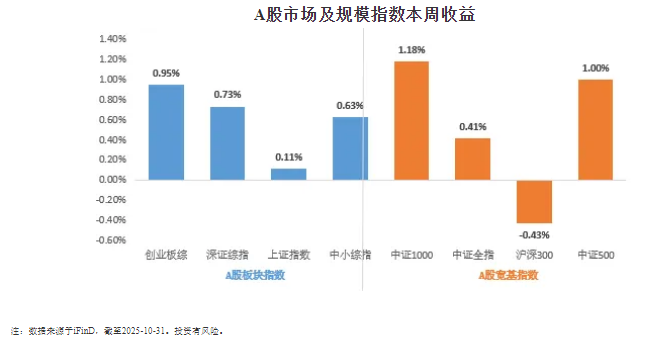 在板块表现方面,创业板综上涨0.95%,深证综指上涨0.73%,上证指数上涨0.11%,中小综指上涨0.63%。规模指数方面,中证1000指数上涨1.18%,中证500指数上涨1.00%。