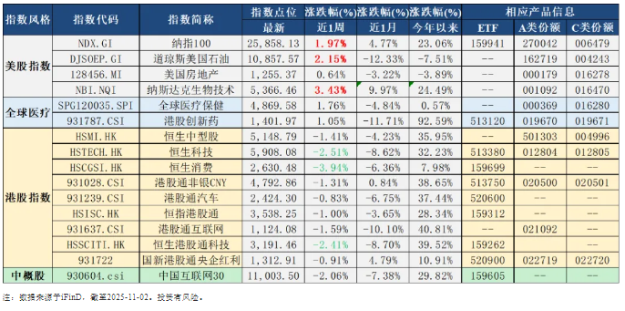 海外市场方面:纳斯达克生物技术表现最好,涨跌幅为3.43%;恒生消费表现最差,涨跌幅为-3.94%。