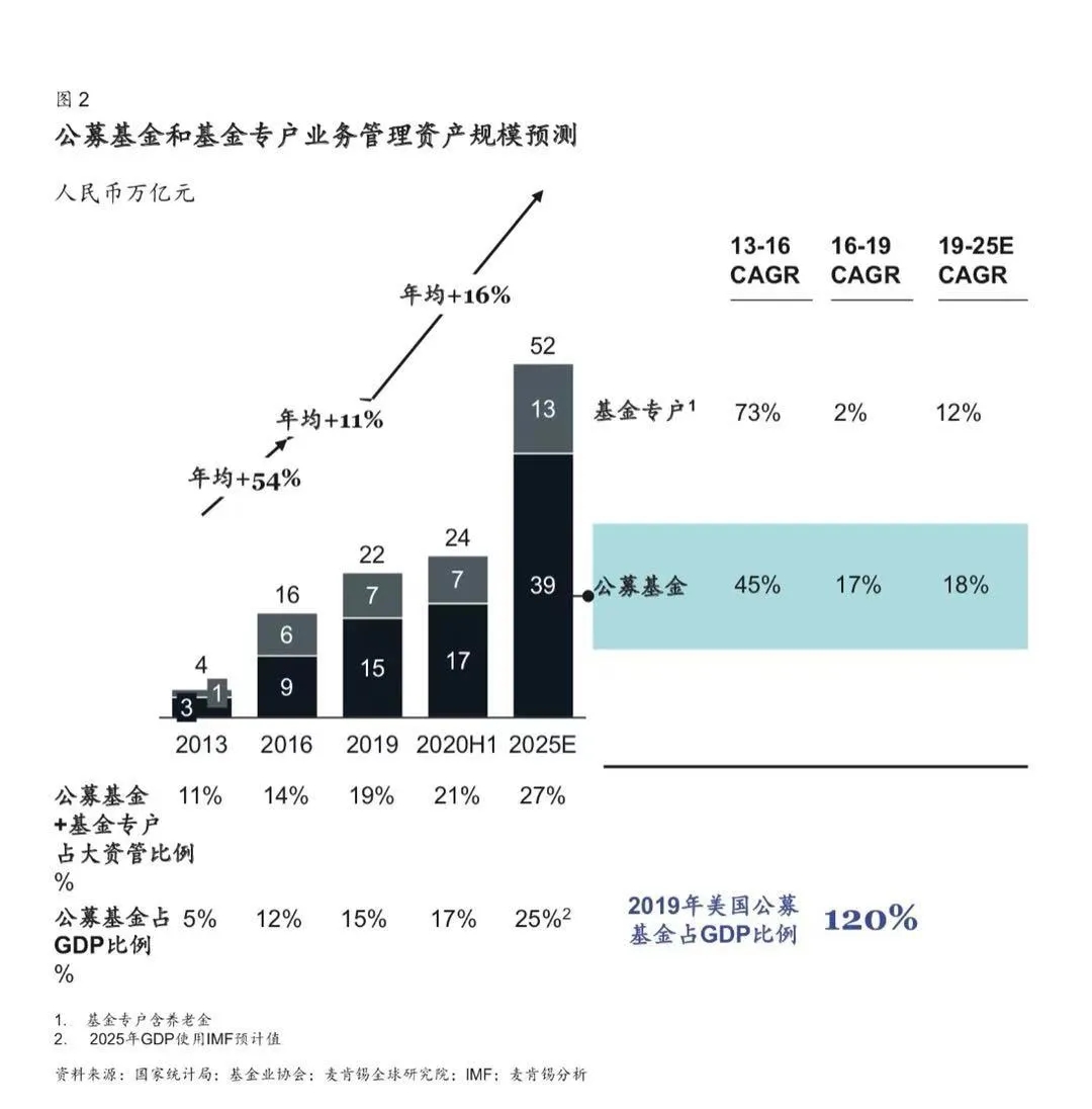麦肯锡预计,中国个人金融资产2019~2025年将保持每年10%的增速,在存款搬家、理财替代、潜在三支柱养老金改革的背景下,预计到2025年公募基金的配置占比将上升到8% 左右,从而创造约16万亿元的增量资金规模。