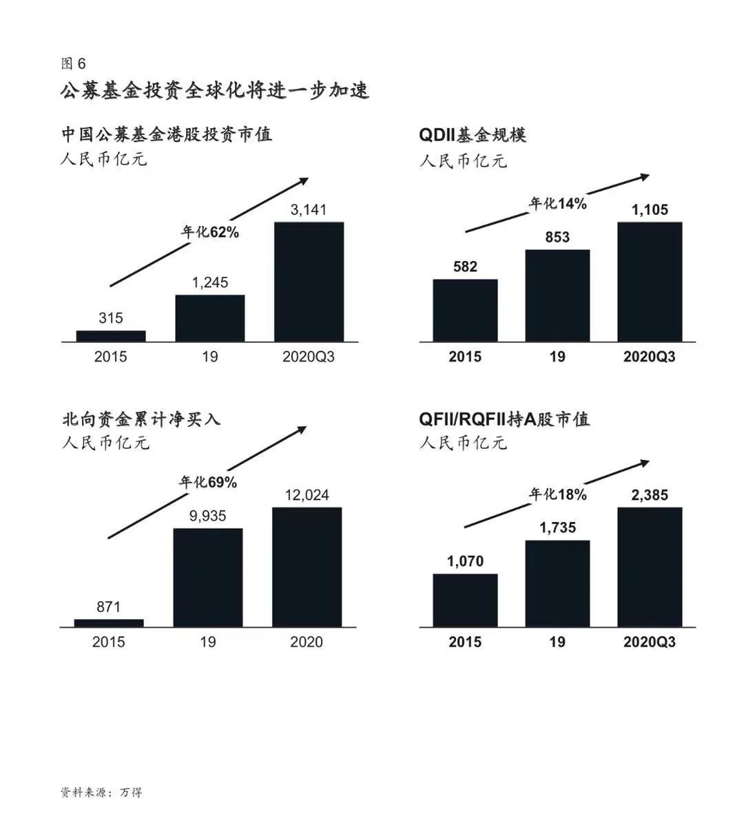 五是中国公募基金全球化投资将进一步加速。2016年到2020年第三季度,我国公募基金港股投资市值年化增速达62%,QDII基金规模年化增速约14%。麦肯锡预计未来5年,随着跨境投资通路和额度的逐步放开,公募基金的全球投资规模将进一步扩大。