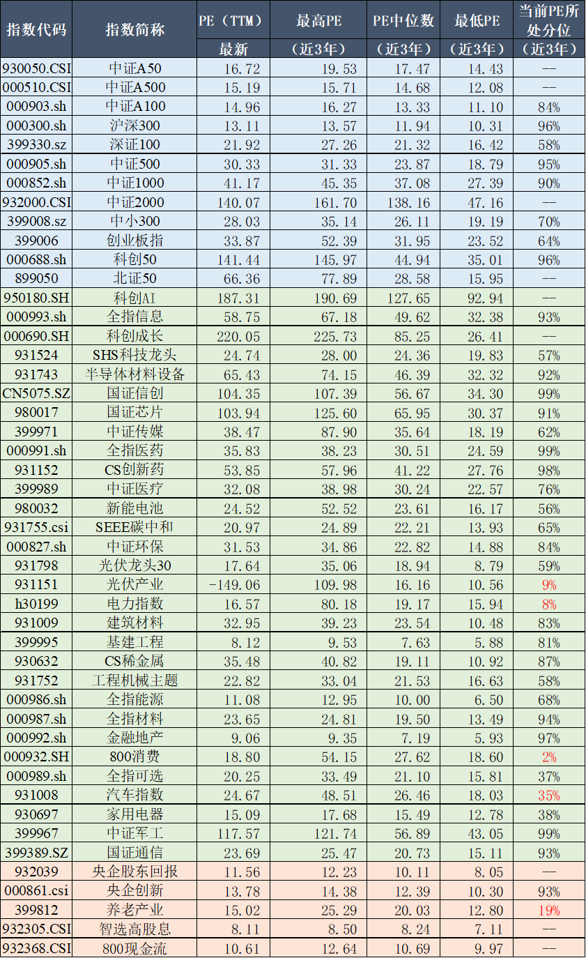 旗下产品跟踪指数近三年PE情况及当前所处位置