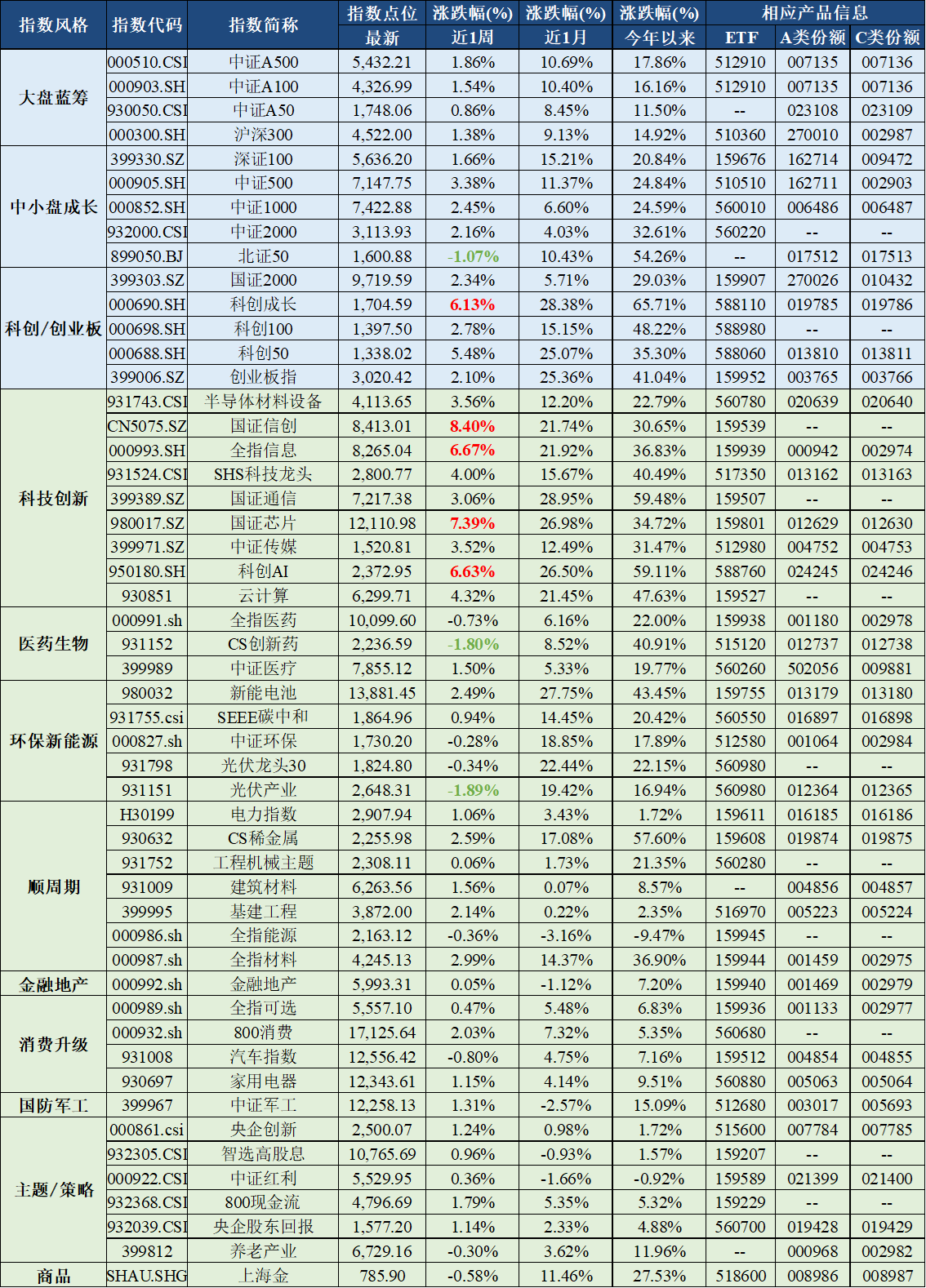 在板块表现方面,创业板综上涨2.01%,深证综指上涨2.36%,上证指数上涨1.52%,中小综指上涨3.08%。规模指数方面,中证1000指数上涨2.45%,中证500指数上涨3.38%。