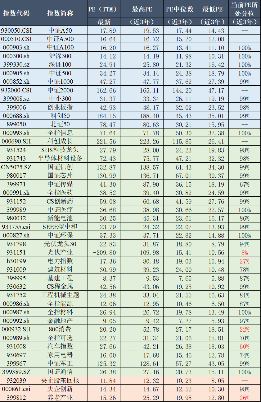 旗下产品跟踪指数近三年PE情况及当前所处位置