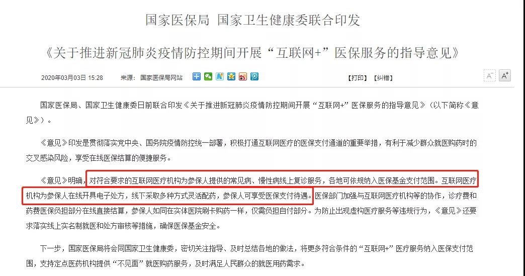 3月3日,国家医保局、国家卫生健康委发布的《关于推进新冠肺炎疫情防控期间开展“互联网+”医保服务的指导意见》进一步提出,将符合条件的“互联网+”医疗服务费用纳入医保支付范围。疫情期间,参保人员只要凭借定点医疗机构在线开具的电子处方,就近在药店购买或通过O2O的方式购买药品,在医保范围内就可以刷卡报销。