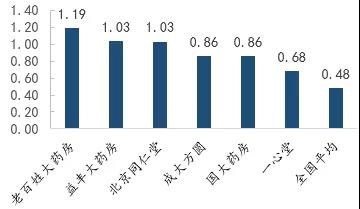 具体到药师服务能力看,大型连锁药店在配置执业药师方面显著领先,注册人数与门店数比例高于全国平均水准一倍,凸显出大型连锁药店在药事服务方向的竞争优势。