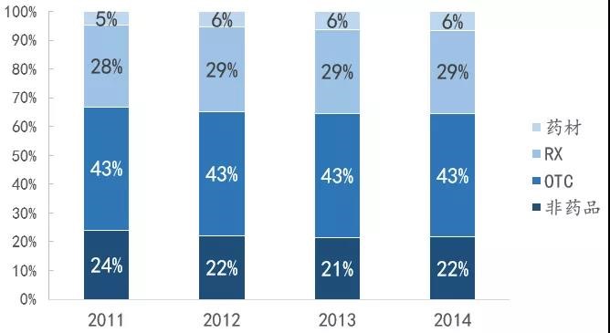 根据中康CMH数据,2014年中国药品零售市场规模2817亿元,其中药品销售占总体市场的78%: