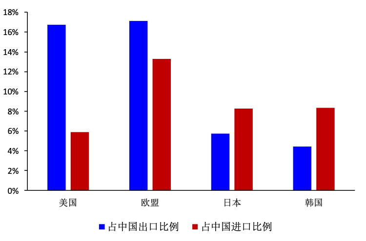 出口贸易方面,2019年,欧盟和美国两者均占中国总出口的17%左右。中国对日韩的出口量,则分别在6%和4%左右。