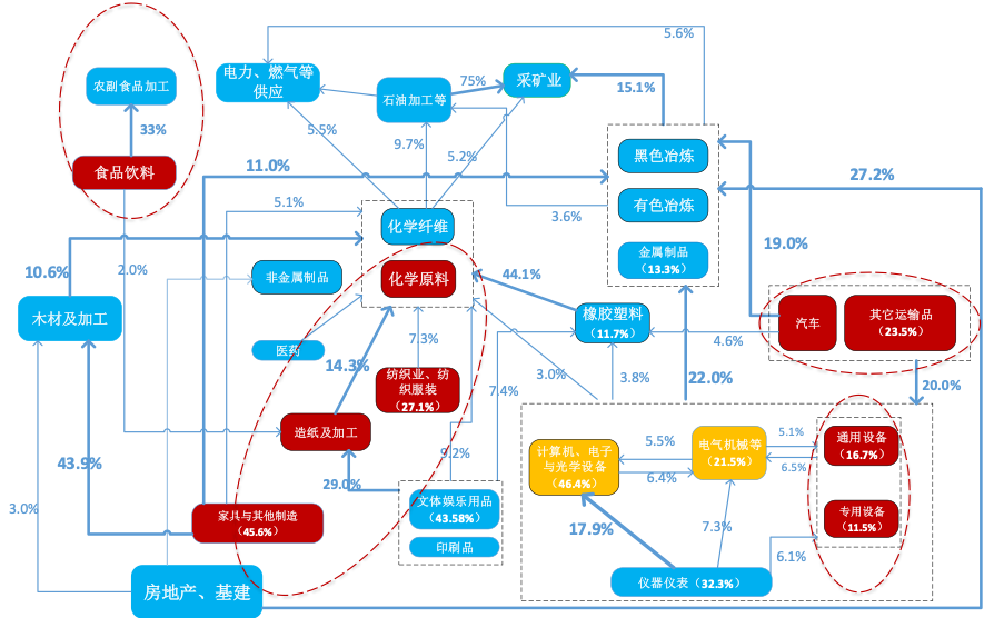 美国在橡胶塑料以及医药行业的上游化工品制造中对中国有一定影响,另外在传统制造业中的家具制造、造纸,以及高技术制造中的机械设备、汽车、其他交通设备均构成中国产业链的上游国家。