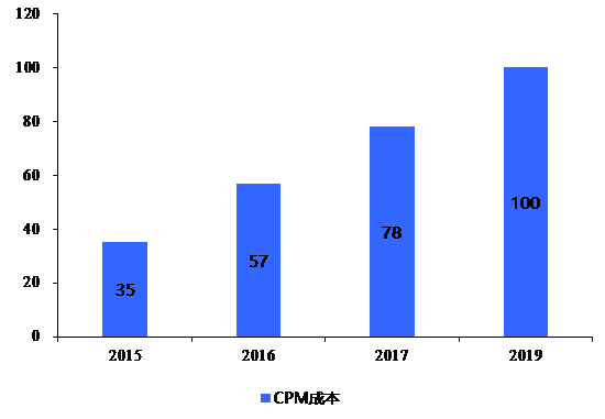 根据WPP的数据,天猫和淘宝为了维持活跃用户所投放的CPM成本,已在四年间从35元增长至100元。