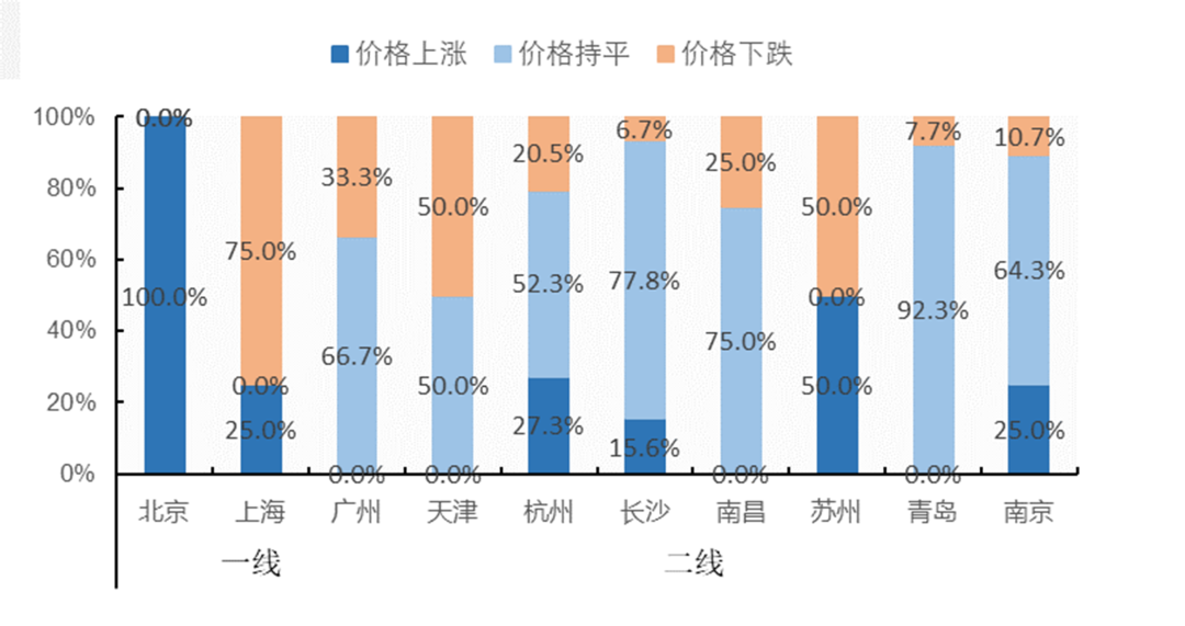 1、上海、苏州、天津采取降价策略的楼盘比例较高。