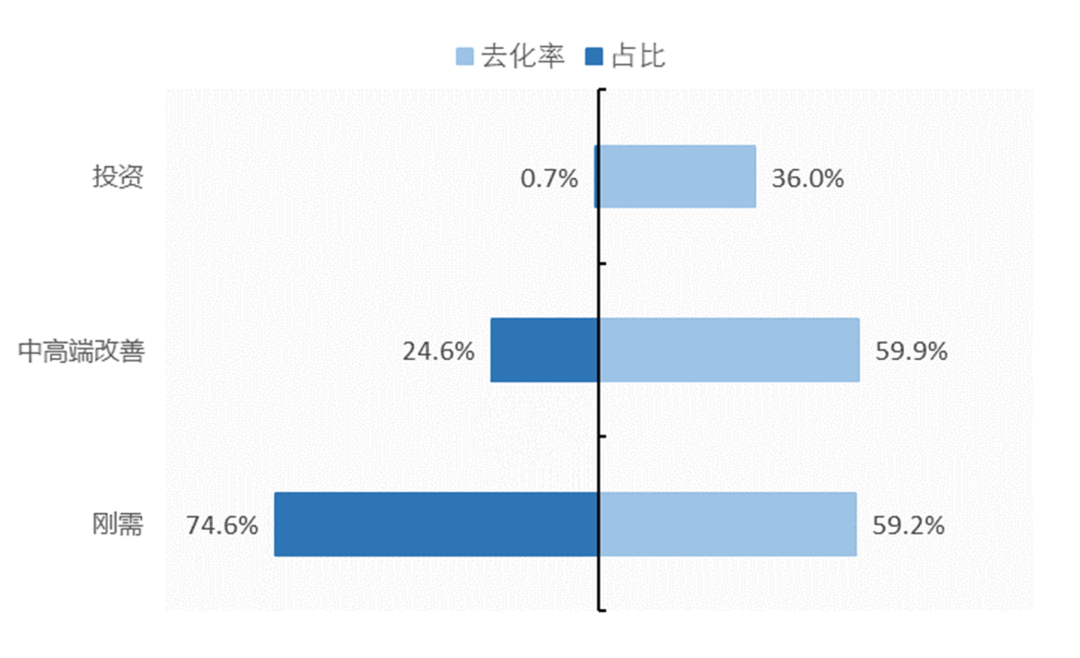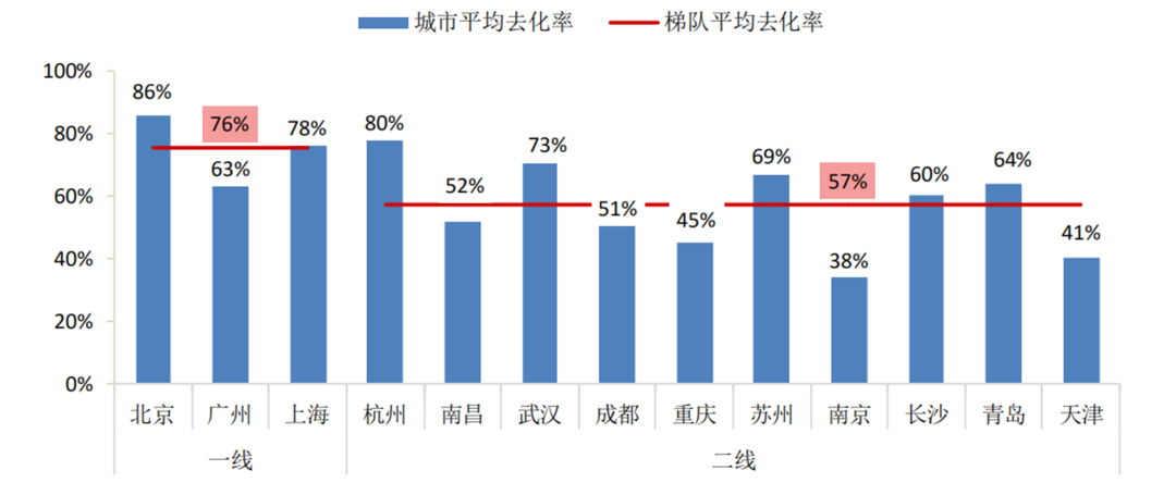 分城市看,能级越高的城市去化率越高,一线城市去化率76%,高于二线城市的57%。