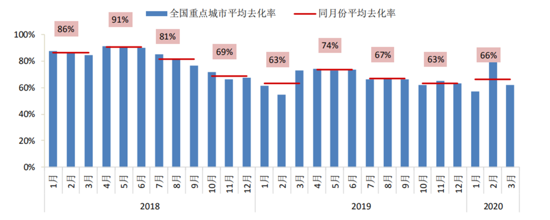 由于受疫情影响,2月推盘量较低,去化率数据偏高,但1月和3月开盘去化率仅略超60%,处于近两年低位。