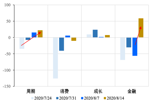 市场疑虑下,投资者风险偏好下降,低风险特征的股票是当前资金流入的主要方向,其中,金融和周期是主要资金流入领域。