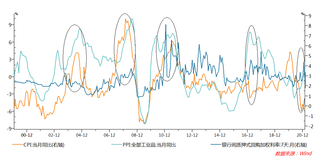 一般来说衡量通货膨胀用GDP平减指数比较准确,重工业化进程完成前,GDP平减指数与CPI、PPI维持较为明显的一致性,2016年供给侧改革后,GDP平减指数与PPI维持同向变化,CPI与PPI以及GDP平减指数开始出现明显的背离,一方面由于供给侧结构性改革后,落后产能得到出清,整体工业产能结构得到优化,第三库存周期启动,需求回暖,工业品出厂价格出现大幅上涨,另一方面,CPI与猪肉价格相关性较高,猪瘟病导致的猪肉价格波动左右CPI走势,2019年以来CPI的上涨主要是猪肉价格波动引致,同期的PPI处于明显的回落趋势中,以猪肉为代表的消费品价格上涨与工业品价格通缩处于并行状态。进入2021年,随着猪肉价格的高基数效应,CPI明显回落,PPI受到疫苗推进加快,疫情拐点出现,全球经济共振复苏的影响出现明显环比以及同比改善,上游大宗商品价格的上涨将对PPI形成强劲支撑。CPI与PPI的背离迹象非常明显。与此同时可以发现,在供给侧结构性改革以后,央行货币政策的通胀观测指标也转变为PPI。银行间质押式7天回购利率和PPI呈现明显的正相关关系,而与CPI呈现负相关特征。