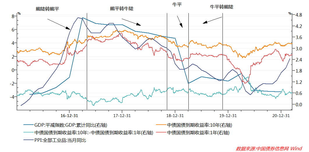 如图5所示,一般来讲,在通货膨胀上行阶段(GDP平减指数和PPI加速上行),收益率曲线体现出熊陡转熊平的特征,经济在投资、消费、出口的驱动下,需求明显改善,工业生产量价齐升,经济出现偏热状态,表征经济增长的十年期国债收益率与表征流动性的一年期国债收益率同时上行,收益率曲线偏熊陡,央行出于给经济降温,通过公开市场操作、MLF操作适度收缩流动性,短端收益率上行速度加快,收益率曲线向熊平转化;