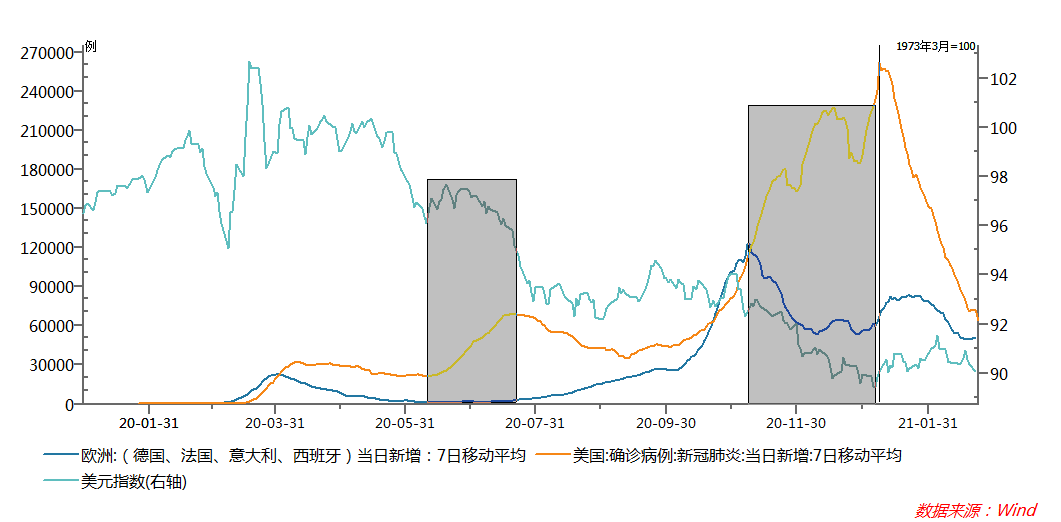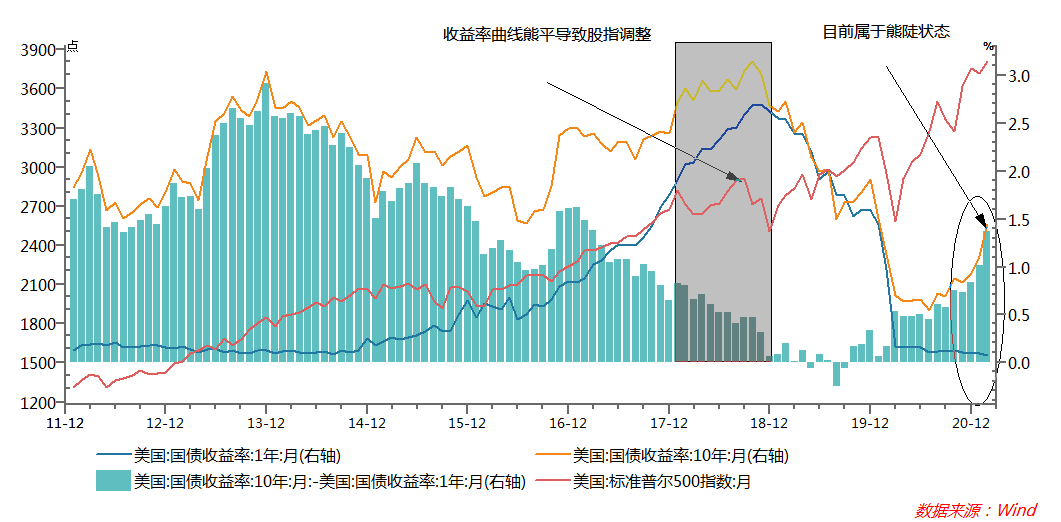 首先,站在全球范围角度看,疫情对于经济社会发展的冲击在疫情防控以及疫苗注射加速推进的背景下,欧洲、美国的新增确诊拐点都已经出现,欧洲新增拐点大概在2020年11月初,美国的新增确诊拐点在2021年1月初,疫情冲击减弱后,经济活动回暖,生产和消费、投资需求反弹,表征欧美经济增长的十年期国债收益率快速回升,收益率曲线呈现熊陡特征,企业盈利改善的预期进一步明确。