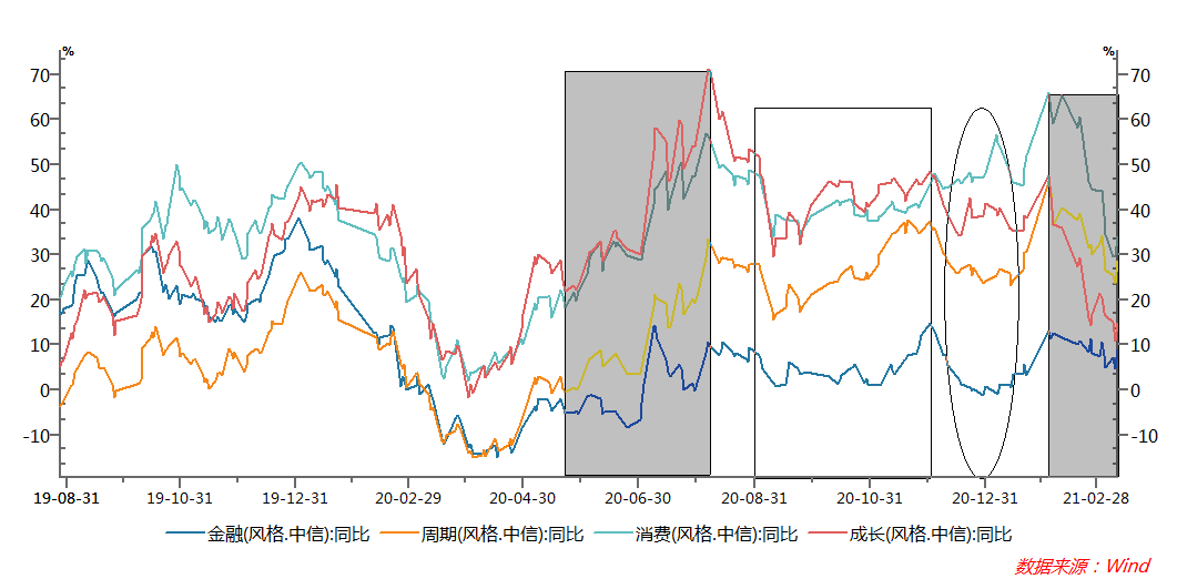 收益率曲线熊陡隐含的市场趋势以及风格含义方面,结合DDM模型以及收益率曲线形态:熊陡代表表征经济增长的十年期国债收益率上行速度要快于表征流动性的一年期国债收益率(一年期国债收益率对于央行OMO操作更加敏感),十年期国债收益率变化在DDM模型中增长代表分子端的盈利,增长可见度提升,分子端的盈利预期进一步改善;流动性代表分母端的无风险收益率以及风险偏好水平,(一般情况下,货币政策边际收紧会导致风险偏好的下降),流动性边际收紧会抑制市场的估值水平,市场处于盈利上升,流动性回落的扭曲状态,在收益率曲线熊陡的状况下,市场表现出周期类股票上涨以及成长类股票估值回落的并行共生状态,指数表现出震荡态势,策略上建议更加关注分子端的盈利弹性,回避估值处于历史高位的品种。行业上建议关注顺周期的上游原材料、中游制造、银行以及前期的疫情受损行业,市场风格表现为价值风格好于成长风格。