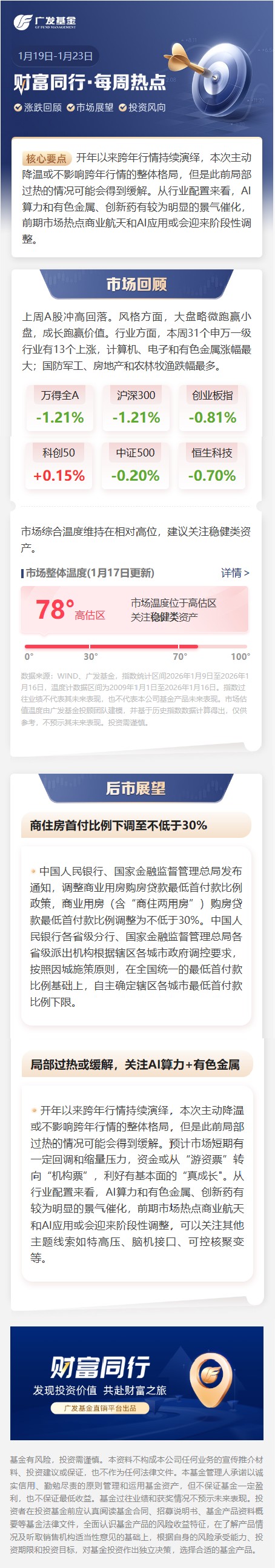 开年以来跨年行情持续演绎,本次主动降温或不影响跨年行情的整体格局,但是此前局部过热的情况可能会得到缓解。从行业配置来看,AI算力和有色金属、创新药有较为明显的景气催化,前期市场热点商业航天和AI应用或会迎来阶段性调整。