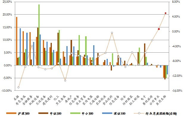本月市场大幅下跌,23个行业中仅医药生物和公用事业行业上涨,采掘、黑色金属行业跌幅最大。从各指数成份股的行业贡献率看,采掘行业的下跌对沪深300指数影响最大,贡献率为19.04%,医药生物行业对沪深300的负贡献影响最大,贡献率为-4.89%;机械设备行业下跌对中证500指数贡献最大,贡献率为14.80%;采掘行业下跌对深证100P指数贡献居首,贡献率为14.57%;机械设备行业下跌对中小300贡献最大,贡献率达23.95%。
