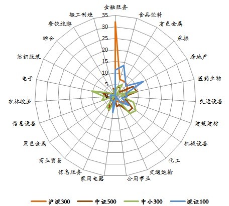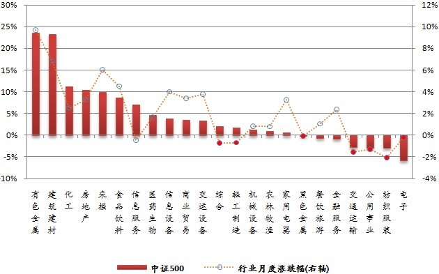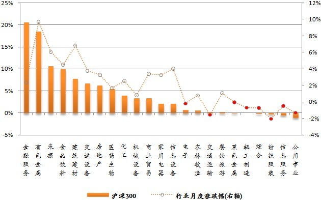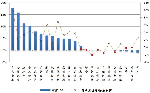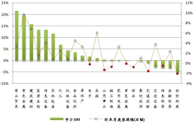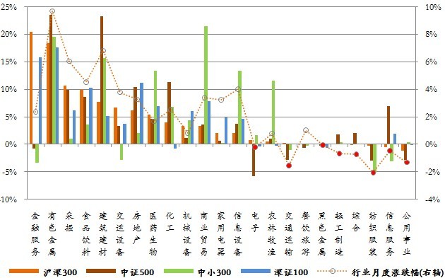 本月市场小幅反弹,除纺织服装、交通运输和公用事业等8个行业下跌外,其余15个行业均上涨,其中,有色金属涨幅达9.7%,建筑建材和采掘行业上涨均超过6%。从各指数成份股的行业贡献率看,金融服务行业的上涨对沪深300指数影响最大,贡献率为18.58%,负贡献沪深300的行业依次为公用事业、信息服务、纺织服装和综合;有色金属行业上涨对中证500指数贡献最大,贡献率达14.34%;有色金属行业上涨对深证100P指数贡献居首,贡献率为21.69%;商业贸易行业上涨对中小300贡献最大,贡献率为4.41%。