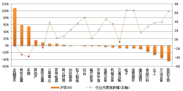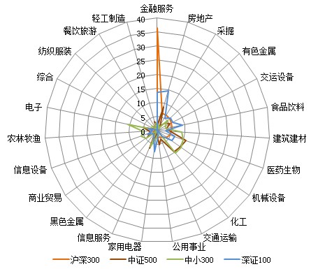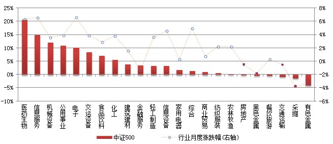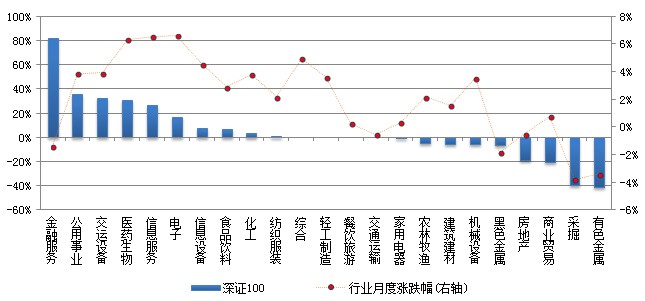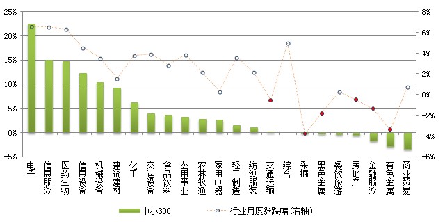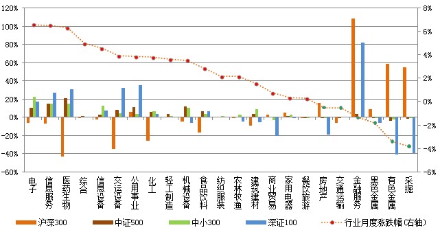 本月市场小幅上涨,申万一级行业涨多跌少,电子、信息服务和医药生物行业上涨超过6%,而采掘和有色金属行业跌幅在3%以上。从各指数成份股的行业贡献率来看,金融服务行业的下跌对沪深300指数影响最大,贡献率高达108%;医药生物行业上涨对中证500指数贡献最大,贡献率为20.6%;金融服务行业上涨对深证100P指数贡献最大,贡献率为82.1%;电子行业上涨对中小300贡献居首,贡献率为22.5%。下图为成份行业贡献率与月度涨跌幅: