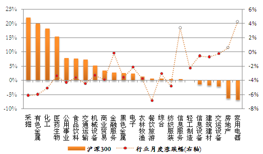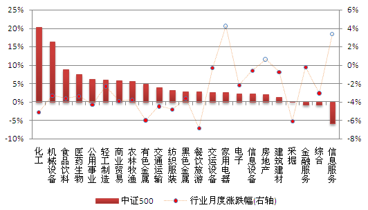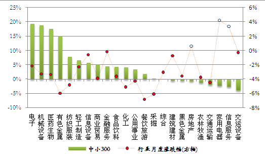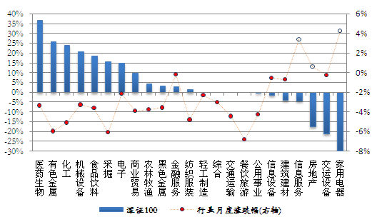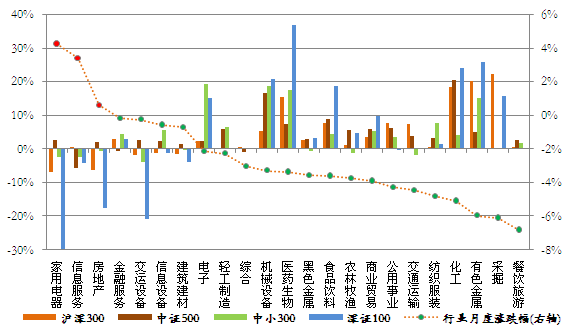 本月市场下跌,申万一级行跌多涨少,仅家用电器、信息服务和房地产行业上涨,其中家电行业上涨4.2%,20个下跌行业中餐饮旅游和采掘行业跌幅超过6%。从各指数成份股的行业贡献率来看,采掘行业的下跌对沪深300指数影响最大,贡献率为22.1%;化工行业下跌对中证500指数贡献最大,贡献率为20.3%;医药生物行业下跌对深证100P指数贡献最大,贡献率达36.8%;电子行业下跌对中小300贡献居首,贡献率为19.3%。下图为成份行业贡献率与月度涨跌幅: