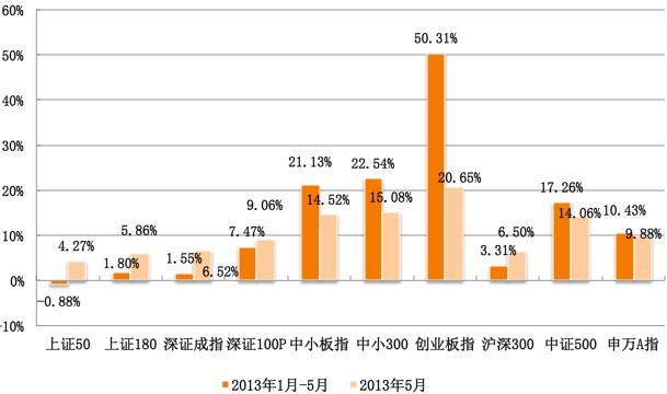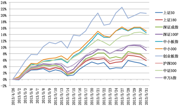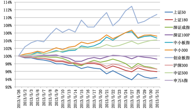 5月沪深两市普涨,覆盖两市的申万A指上涨9.88%。指数方面,本期核心市场指数中,创业板指表现最佳,大幅上涨20.65%,上证50涨幅最小,上涨4.27%上。