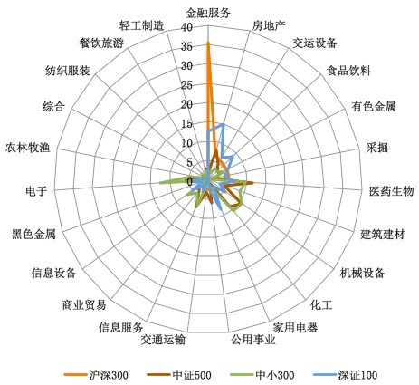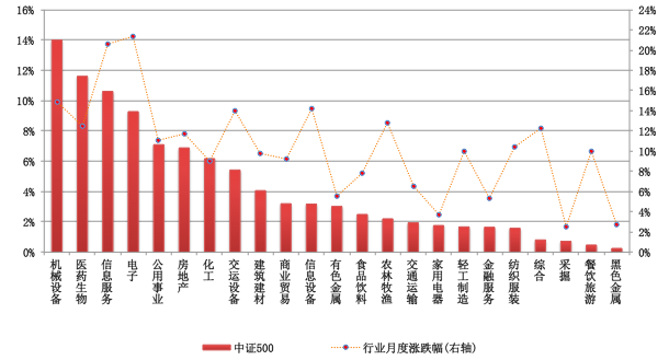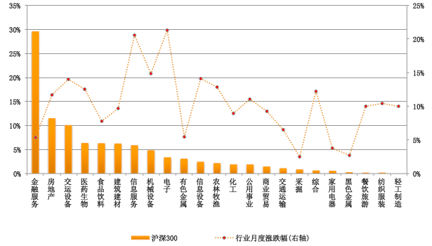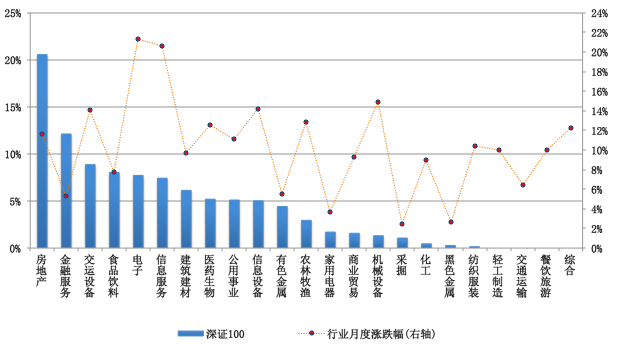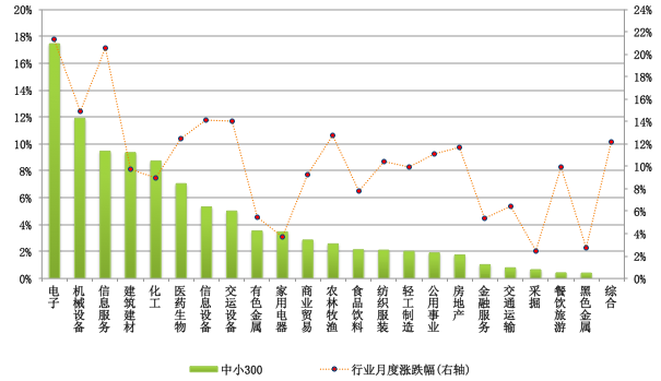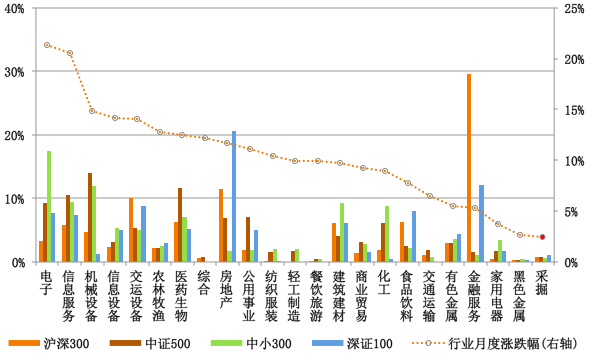 本月市场大幅反弹,申万一级行业全部上涨,其中电子和信息服务行业涨幅超过25%,而采掘、黑色金属和家用电器行业涨幅均不到4%。从各指数成份股的行业贡献率来看,金融服务行业的上涨对沪深300指数影响最大,贡献率为29.6%;机械设备行业上涨对中证500指数贡献最大,贡献率为14.0%;房地产行业上涨对深证100P指数贡献最大,贡献率达20.6%;电子行业上涨对中小300贡献居首,贡献率为17.4%。下图为成份行业贡献率与月度涨跌幅: