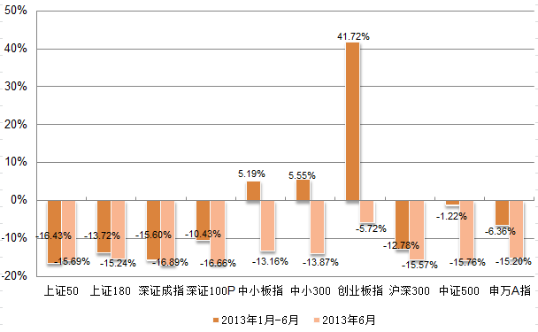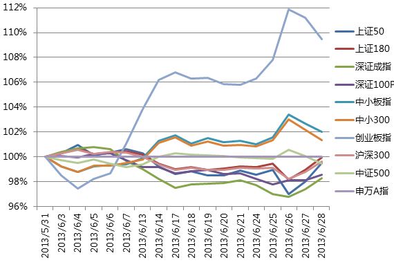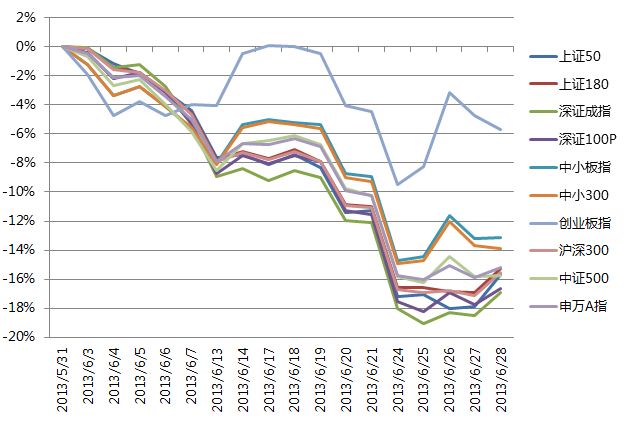 6月沪深两市大幅下跌,覆盖两市的申万A指下跌15.2%。指数方面,本期核心市场指数中,创业板指表现最佳,跌幅为5.72%,深证成指跌幅最大,下跌16.89%。
