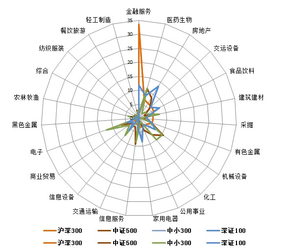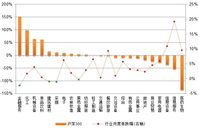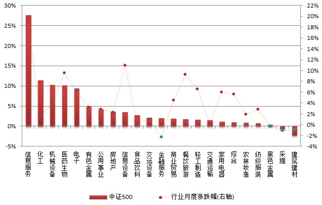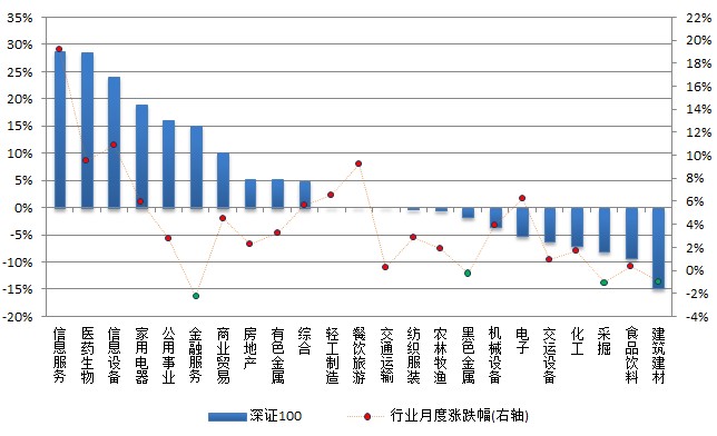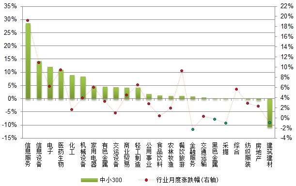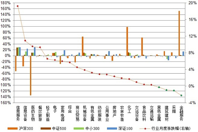本月市场小幅上涨,申万一级行业涨多跌少,其中信息服务和信息设备行业涨幅超过10%,而金融服务和采掘行业下跌1%以上。从各指数成份股的行业贡献率来看,金融服务行业的下跌对沪深300指数影响最大,贡献率为152.2%;信息服务行业上涨对中证500指数贡献最大,贡献率为27.6%;信息服务行业上涨对深证100P指数贡献最大,贡献率达28.7%;信息服务行业上涨对中小300贡献居首,贡献率为28.6%。