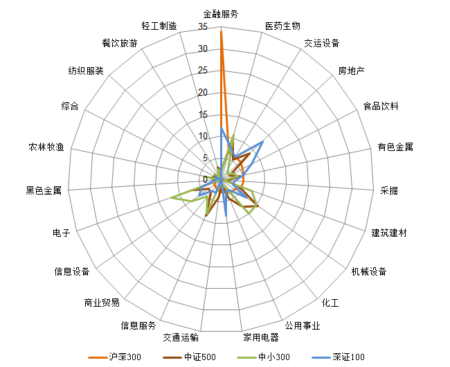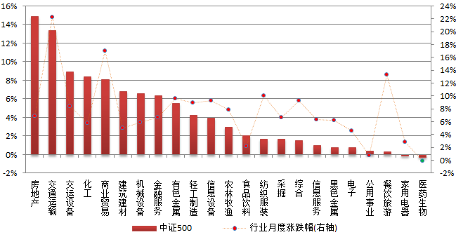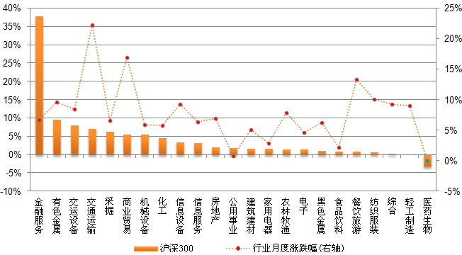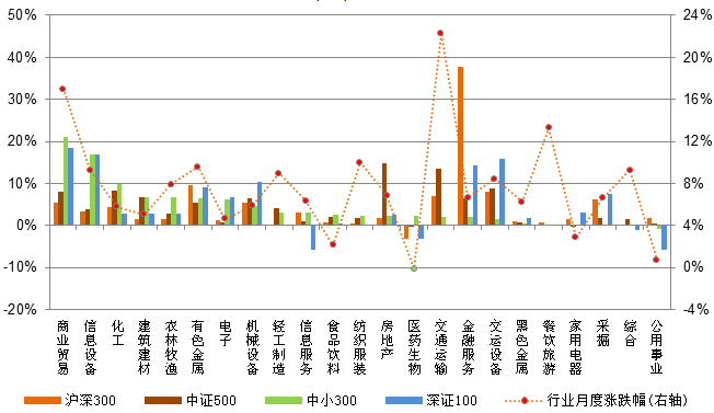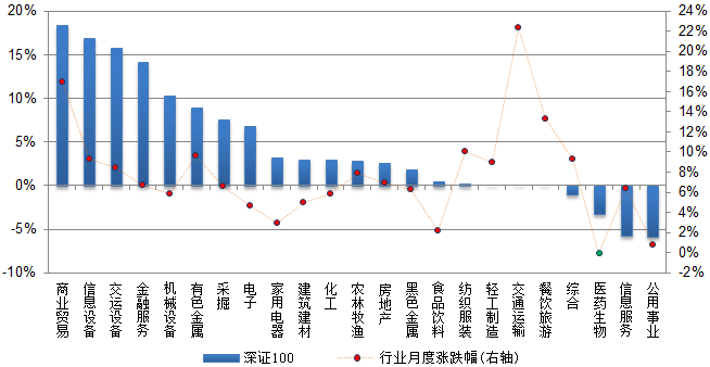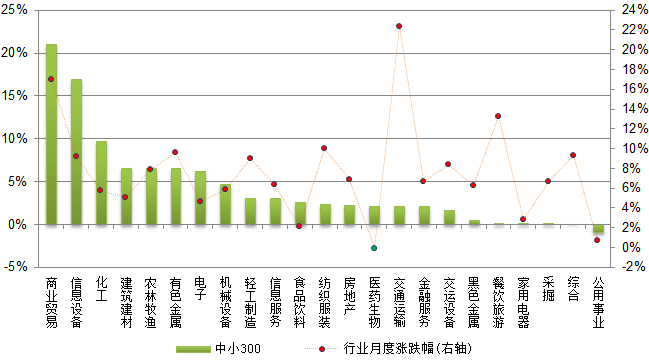 本月市场继续上涨,申万一级行业仅医药生物微跌0.05%,22个上涨行业中交通运输和商业贸易行业涨幅超过16%,公用事业行业上涨不到1%。从各指数成份股的行业贡献率来看,金融服务行业的上涨对沪深300指数影响最大,贡献率为37.8%;房地产行业上涨对中证500指数贡献最大,贡献率为14.9%;商业贸易行业上涨对深证100P指数贡献最大,贡献率达18.4%;商业贸易行业上涨对中小300贡献居首,贡献率为21.1%。