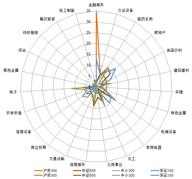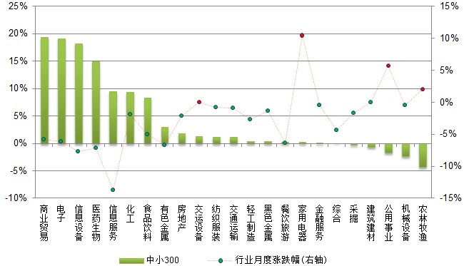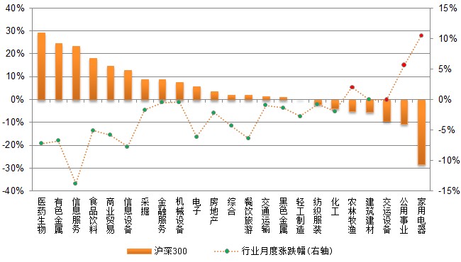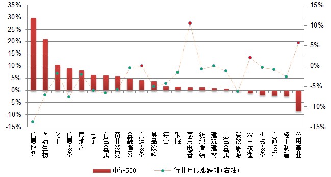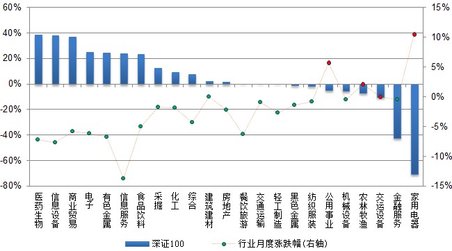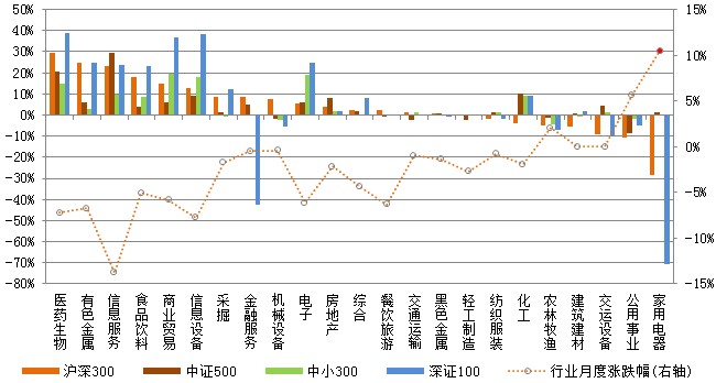 本月市场下跌,申万一级行业中仅家用电器、公用事业、农林牧渔和交运设备4个行业上涨,其中家用电器行业上涨超10%。19个下跌行业中,信息服务跌幅超过13%。从各指数成份股的行业贡献率来看,医药生物行业的下跌对沪深300指数影响最大,贡献率为29.4%;信息服务行业下跌对中证500指数贡献最大,贡献率为29.6%;医药生物下跌对深证100P指数贡献最大,贡献率达38.6%;商业贸易行业下跌对中小300贡献居首,贡献率为19.4%。
