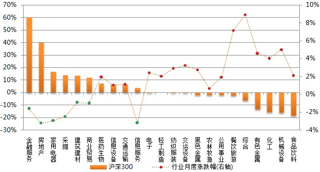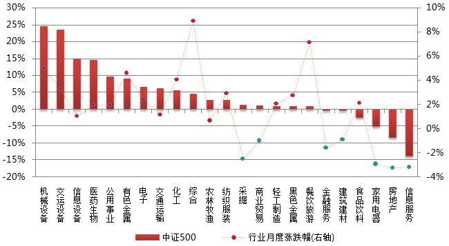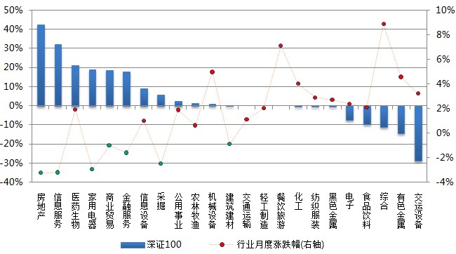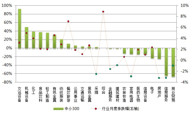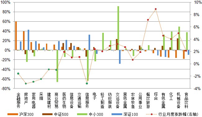 本月市场小幅上涨,申万一级行业中房地产、信息服务、家用电器等7个行业下跌0.91%-3.23%,其余16个申万一级行业均上涨,其中综合和餐饮旅游行业表现抢眼,涨幅均在7%以上。从各指数成份股的行业贡献率来看,金融服务行业的下跌对沪深300指数影响最大,贡献率为60.2%;机械设备行业上涨对中证500指数贡献最大,贡献率为24.6%;交运设备行业上涨对中小300指数贡献居首,贡献率高达91.8%;房地产行业对深证100指数贡献最大,贡献率为42.5%。