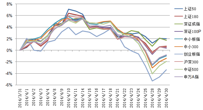 4月沪深两市下跌,覆盖两市的申万A指下跌0.79%。指数方面,本期核心市场指数中,上证50涨幅居首,上涨1.98%;而创业板指表现最差,跌幅为3.36%。