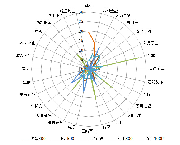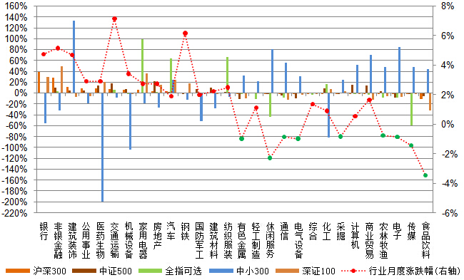 本月市场涨跌不一,申万28个一级行业涨跌互现,其中交通运输本月上涨7.15%,涨幅最大。从各指数成份股的行业贡献率来看,银行行业的上涨对沪深300指数影响最大,贡献率为38.92%;房地产行业上涨对中证500指数贡献最大,贡献率为22.12%;建筑装饰行业上涨对中小300指数贡献居首,贡献率为132.14%;非银金融行业对深证100指数贡献最大,贡献率为48.69%;家用电器对全指可选指数的贡献最大,贡献率为98.69%。
