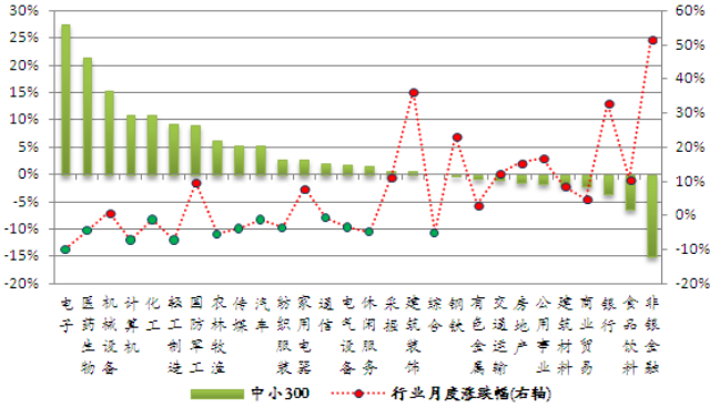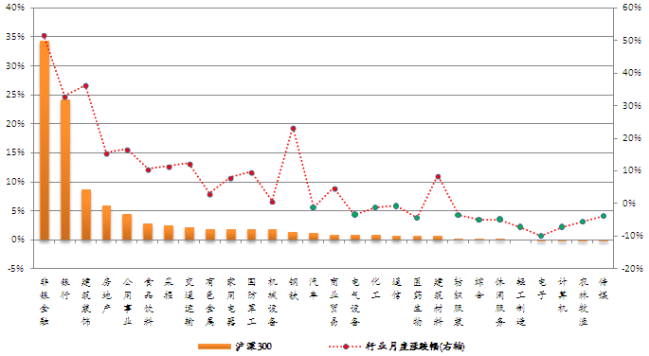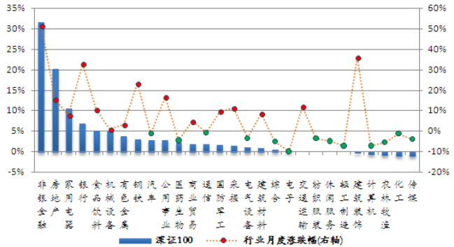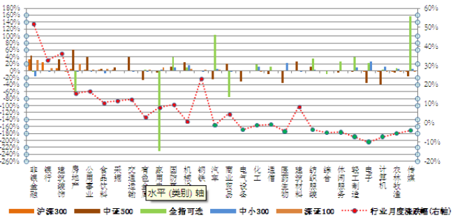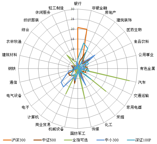 以巨潮数据库提供的权重数据计算,本月末银行行业在沪深300指数中所占权重居首,为20.76%。房地产、医药生物和机械设备行业在中证500指数中权重居前,依次为9.20%、8.03%和7.42%。汽车、家用电器、传媒在全指可选指数中权重较大,分别为26.51%、18.11%、15.49%。计算机、医药生物、电子在中小300指数中权重居前,分别为11.62%、11.54%和11.41%。非银金融、房地产、家用电器在深证100指数中权重位列前三,依次为13.24%、11.35%和8.39%。