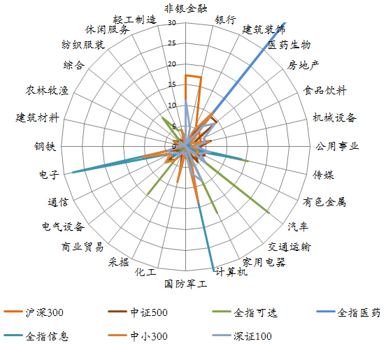以巨潮数据库提供的权重数据计算,本月末非银金融行业在沪深300指数中所占权重居首,为17.33%。房地产、医药生物和计算机行业在中证500指数中权重居前,依次为9.49%、9.40%和6.49%。汽车、家用电器、传媒在全指可选指数中权重较大,分别为25.65%、17.76%、15.5%。计算机、电子和传媒行业在全指信息指数中占比较大,依次为45.98%、27.86%和13.69%。计算机、电子、医药生物在中小300指数中权重居前,分别为13.85%、10.76%和10.67%。非银金融、房地产、家用电器在深证100指数中权重位列前三,依次为11.17%、9.05%和9.02%。