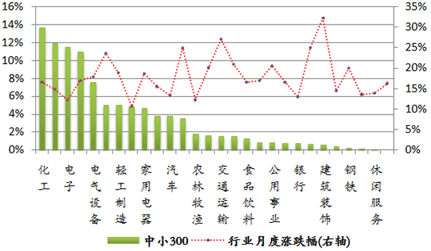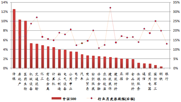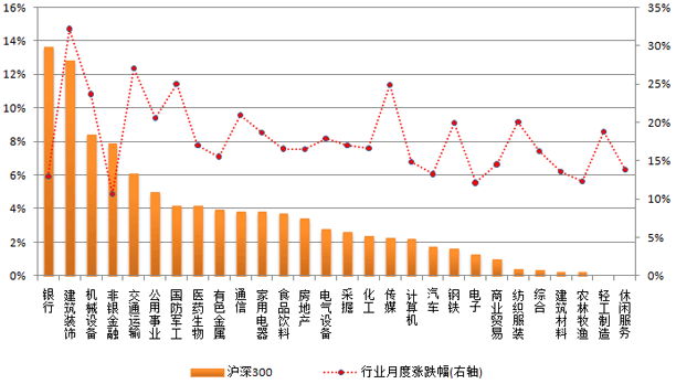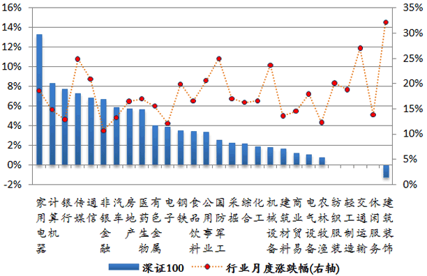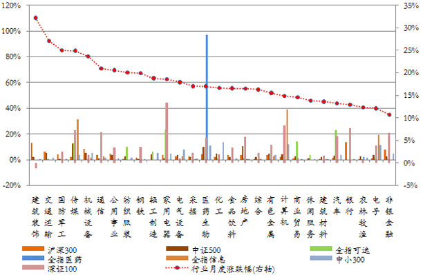 本月市场继续上行,申万28个一级行业全部上涨,建筑装饰行业涨幅高达32.18%。从各指数成份股的行业贡献率来看,银行业对沪深300指数影响最大,贡献率为13.65%;传媒行业对中证500指数贡献最大,贡献率为12.54%;家用电器行业对全指可选指数的贡献最大,贡献率为23.51%;医药生物行业对全指医药贡献率为97.09%;计算机行业对全指信息指数贡献居首,贡献率为39.09%;化工行业对中小300指数贡献居首,贡献率为13.72%;家用电器行业对深证100指数贡献最大,贡献率为13.35%。