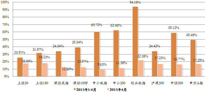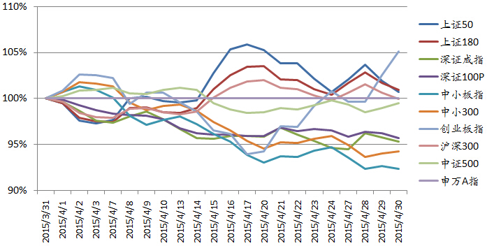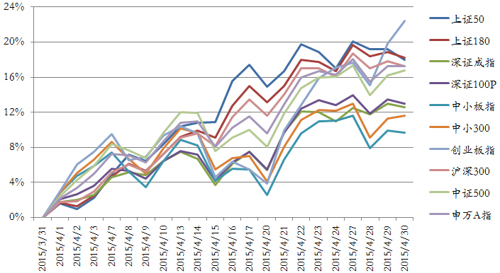 4月沪深两市上涨,覆盖两市的申万A指上涨17.29%。指数方面,本期核心市场指数中,创业板指涨幅居首,上涨22.38%;中小板指表现最差,涨幅为9.63%。