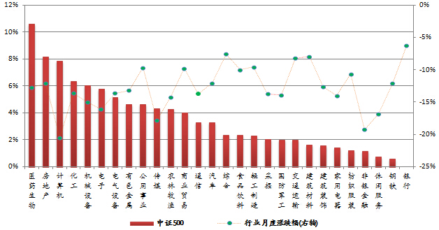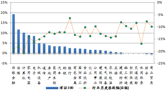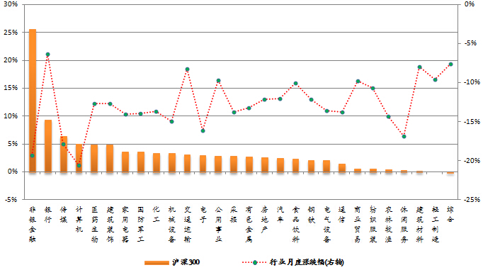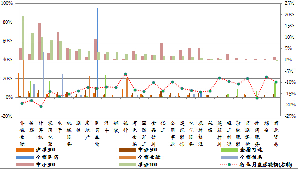 本月市场依然下跌,申万28个一级行业全部下跌,计算机行业跌幅居首,下跌20.55%。从各指数成份股的行业贡献率来看,非银金融行业对沪深300指数影响最大,贡献率为25.6%;医药生物行业对中证500指数贡献最大,贡献率为10.61%;计算机行业对中小300指数贡献居首,贡献率为16.19%;非银金融行业对深证100指数贡献最大,贡献率为19.37%。