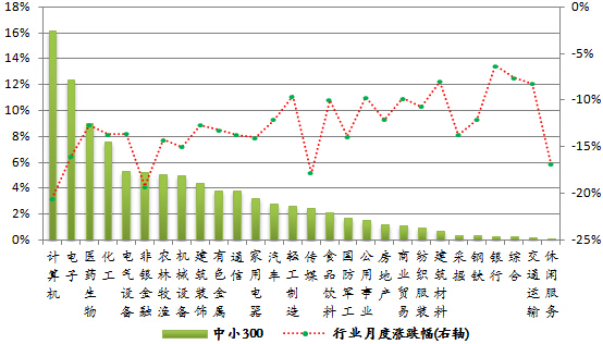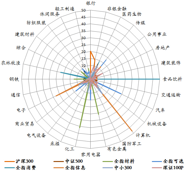 以巨潮数据库提供的权重数据计算,本月末银行业在沪深300指数中所占权重居首,为19.33%。医药生物、房地产和化工行业在中证500指数中权重居前,依次为12.03%、7.88%和6.62%。汽车、传媒、家用电器在全指可选指数中权重较大,分别为23.6%、17.3%、16.1%。计算机、医药生物和电子在中小300指数中权重居前,分别为13.54%、10.53%和9.77%。传媒、房地产和非银金融在深证100指数中权重位列前三,依次为9.61%、9.55%和8.92%。