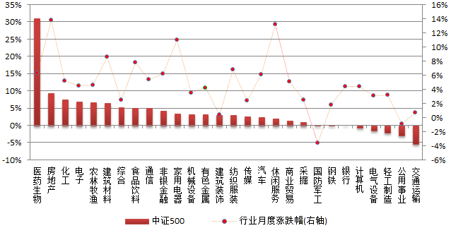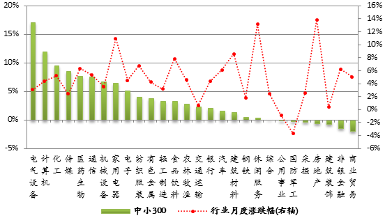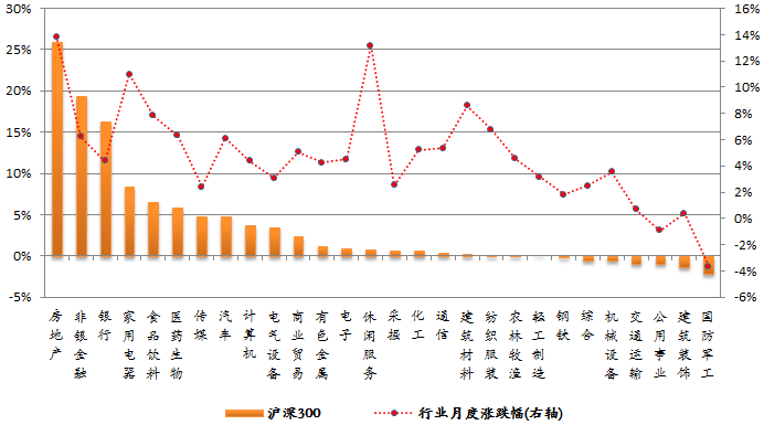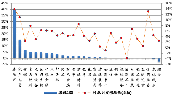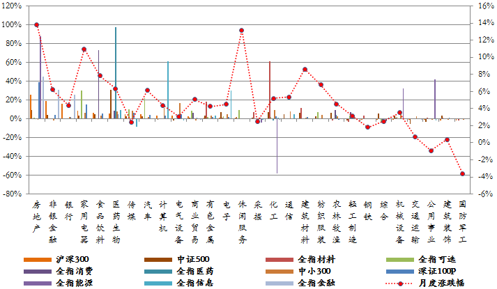 本月市场持续上行,申万28个一级行业涨多跌少,房地产、休闲服务和家用电器行业涨幅均超10%,国防军工和公用事业行业小幅下跌。从各指数成份股的行业贡献率来看,房地产行业对沪深300指数影响最大,贡献率为25.92%;医药生物行业对中证500指数贡献最大,贡献率为31.02%;电气设备行业对中小300指数贡献居首,贡献率为17.01%;房地产行业对深证100指数贡献最大,贡献率为39.14%。