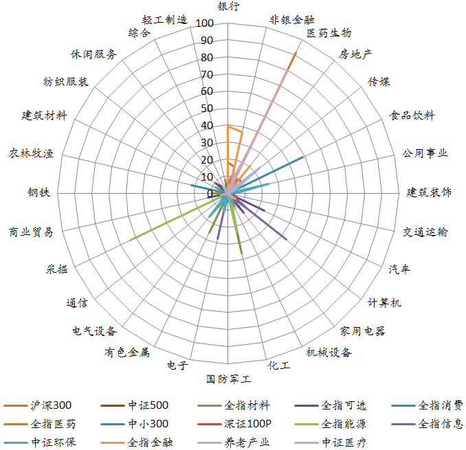 以巨潮数据库提供的权重数据计算,本月末银行业在沪深300指数中所占权重居首,为17.95%。医药生物、房地产和计算机行业在中证500指数中权重居前,依次为10.92%、6.79%和5.89%。计算机、电子和医药生物行业在中小300指数中权重居前,分别为13.85%、10.19%和10.09%。房地产、非银金融和传媒行业在深证100指数中权重位列前三,依次为10.60%、10.53%和9.42%。