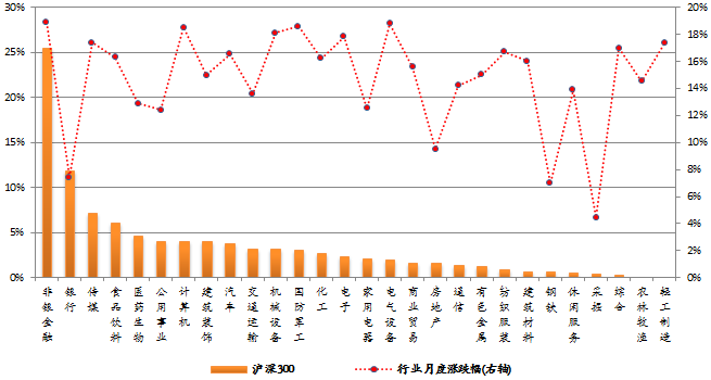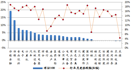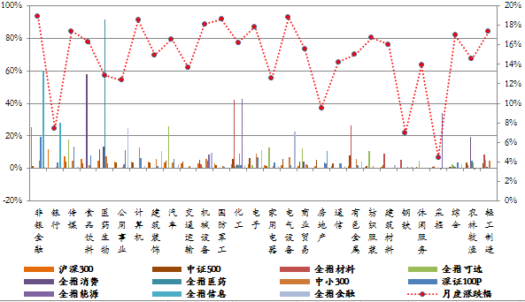 本月市场止跌反弹,申万28个一级行业全部上涨,非银金融、电气设备、国防军工、计算机和机械设备行业的涨幅均超过18%,采掘和钢铁行业涨幅不到7%。从各指数成份股的行业贡献率来看,非银金融行业对沪深300指数影响最大,贡献率为25.5%;医药生物行业对中证500指数贡献最大,贡献率为11.6%;计算机行业对中小300指数贡献居首,贡献率为13.0%;非银金融行业对深证100指数贡献最大,贡献率为19.3%。