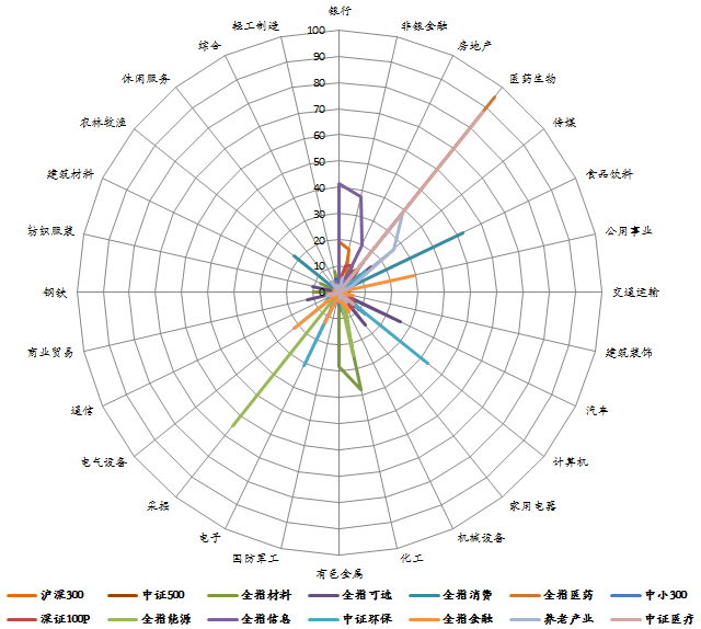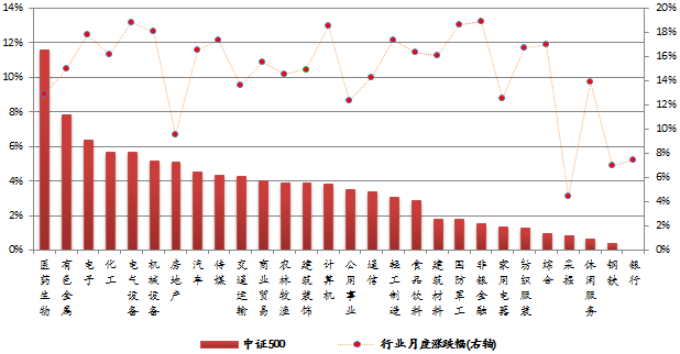 以巨潮数据库提供的权重数据计算,本月末银行业在沪深300指数中所占权重居首,为19.09%。医药生物、房地产和有色金属行业在中证500指数中权重居前,依次为11.9%、6.86%和6.68%。计算机、电子和医药生物行业在中小300指数中权重居前,分别为12.98%、10.14%和9.99%。房地产、传媒和非银金融行业在深证100指数中权重位列前三,依次为11.28%、10.59%和10.57%。